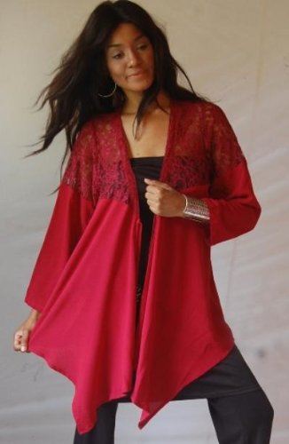 Well, this chic new jacket proves one thing for sure. You don't have to "expose it all" like so many of the new fashions do, in order to look sexy.In fact, Annie's latest wrap will leave you looking hot as a jalapeno, and all that's exposed is a bit of shoulder. (She's a genius!)The jacket has an open front with attached string ties hat are weighted with Chinese coins at the ends. Sleeves are full-length and moderately wide and the overall form flows out below the bust like an a-line. Sections of lace are inset at the shoulders and upper bodice to create an aura of feminine mystique and charm.The hemline is stylishly angled, longest point at the front and back centers. Length is generously below the hip.Made up in Lotustraders' top quality textured rayon, a silky, soft fabric with a delicious drape and flow. Lace is top quality also and matches the main fabric.Wear this intriguing little wrap with care ladies. It kind of sneaks up on you. It won't really leave you feeling exposed like a lot of other fashions might......so you might not realize.....you'll be one hot mama in this.