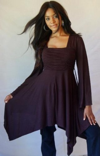 This captivating new style radiates a romantic elegance that's oh-so-hard to find. Though it's rare, you know it when you see it. And this is it....Starts with a deep squared neckline (nothing's more flattering) the bodice is made up of horizontally pleated fabric and the full-length sleeves are bell-shaped. The baby doll waistline is raised to below the bust, and the 'skirt' flares out in a sharp a-line.The asymmetric hemline angles in multiple dips and points to create a very charming finish. Overall length is mid-thigh.Made up in a top quality stretch rayon jersey, a sleek, non-clingy fabric you'll really enjoy. Emphasize your feminine side in this romantically elegant top. You'll feel like a princess in this.