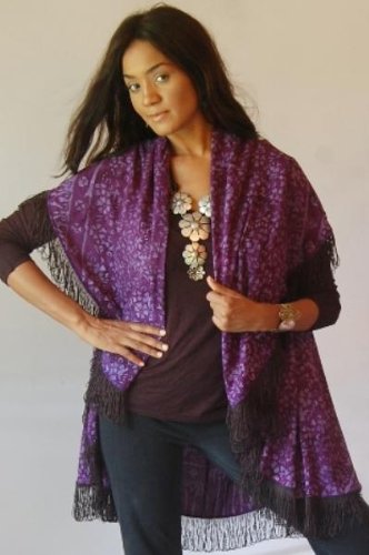 The Detailed Description of PLUM JACKET WRAP FRINGED 2-HOLE BATIK SHAWL COLLAR - FITS (ONE SIZE) - M L 1X 2X - Z126S LOTUSTRADERSFeatures