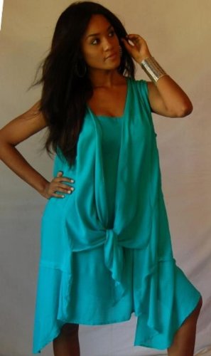 What a classy little dress! It's just packed with the casual elegance we all adore.It's a layered style, with the over-layer open at the center front. Separated, dangling panels at each side allow you to tie it at the waist. The panels drape longer at each hip, creating the irregular hemline so much in vogue right now. Overall form is a-line and length is just above the knee on most.Made up in a light and delicate rayon chiffon with a silky, soft and sensuous texture you'll surely enjoy. The ephemeral quality of the fabric has a truly magical effect that's as feminine as can be.Wear it alone as a sexy little mini or as a summer top over pants or a skirt, the possibilities are virtually limitless with this versatile garment.