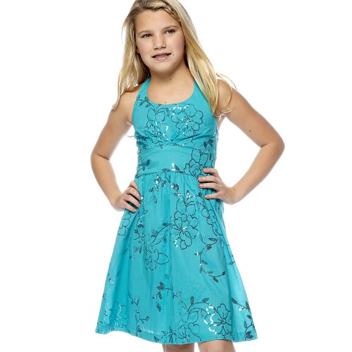 Beautiful TURQUOISE-BLUE SEQUIN-FLORAL WOVEN HALTER DRESS features sleeveless bodice with V-PLEAT DETAILS and STRETCHABLE ELASTIC HALTER STRAPS behind neck. Fully lined, knee-length TURQUOISE-BLUE WOVEN SKIRT features SPARKLING SEQUIN-FLORAL DETAILS with back zip closure and STRETCHABLE ELASTIC BAND IN BACK for comfortable fit. Hand wash, line dry. Imported (El Salvador). Of 100% cotton - Lining of polyester - Exclusive of trim/decoration. Matching/Coordinating sister styles available in sizes 7-16, search for style(s): RRE-43832. More baby & girl party dresses available, search for: "rre-girl-party-dress "