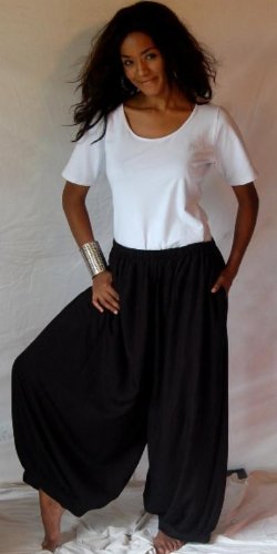 You'll LOVE these for their easy-to-wear comfort. You'll adore them for their figure-flattering style. And you'll be especially PLEASED with their 'go with everything' versatility.They're designed with a wide elasticised waist (oh, so comfortable!) with drawstring so that you can adjust the fit to be perfectan and side nice pockets. The legs are cut to be very full and flowing and then are gathered in at the ankle with elasticised cuffs.Made up in Lotustraders' very finest smooth and silky rayon, a fabric with just the right weight and flow to enhance the design. Easy care, too, cold water wash, drip dry (this is important because you'll be wearing these a lot.)Bound to become a wardrobe basic and a wear-it-everywhere favorite, these harems are authentic gems.