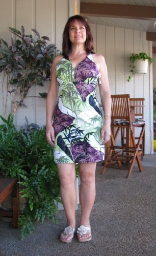 The Detailed Description of Sexy Halter Dress - Women's Bamboo Asian Artistry Hawaiian Aloha Crisscross Back Fitted Halter Sundress in Green/Purple - XL