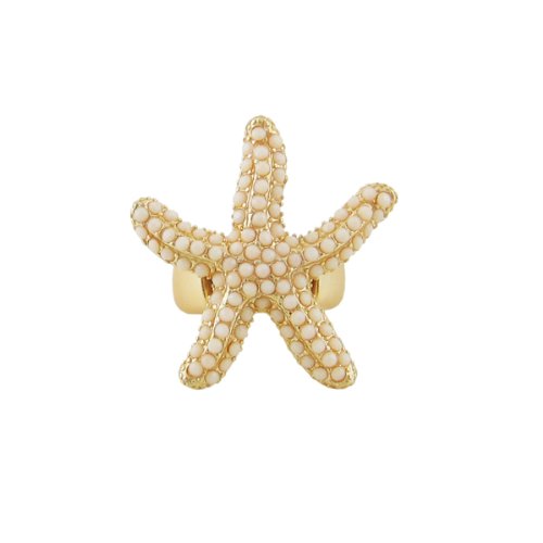 This stretch ring features a cute starfish with high quality beads. The band has metal links on an elastic band that fits on every finger. Gold tone. Matte finish.1-1/2"H x 1-3/8"W