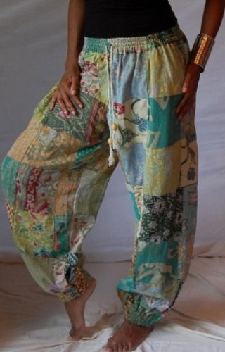 Cotton is such a wonderful warm weather fabric, soft and absorbent, crisp and cool. These harems are wonderful as well, great design meets great fabric and combines for great fashion.The waistline is a broad band of elasticised smocking and a rope drawstring allows you to get the fit just right. The legs are cut wie through the hips and thighs and then nbegin to taper at he ankles.Made up in a patchwork structure of cotton batik fabrics that have vintage-inspired prints. Don't miss out on these, ladies, they're exceptional summer-time pants. Please see our store for matching coordinates.