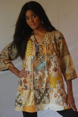It seems like every season I have one top that becomes a "favorite." I wear it over and over and over again. It's reassuring to have something that you know you can rely on to feel food and look good, too. So when you get crazy busy (it's inevitable) you know that you can throw this on, no fuss, no bother, and look your best.For a lot of us, this could be that 'top of the season.' It's truly comfortable and carefree, with the loose a-line or trapeze form that broadens at the hip and the practical 3/4-length sleeves. It's so stylish, with the string tie lacings at the bodice. The patched cotton batiks have an 'antique' or retro look that's the cat's meow right now, plus the 100% natural fiber fabric is just such a pleasure to wear.Looks great with jeans, gauchos (please see our store) or leggings. Even a skirt (try it with a belt.)We all have different taste. So this may or may not be your 'favorite of the season.' But this top has so many endearing qualities, the chances you'll love it are sky high.