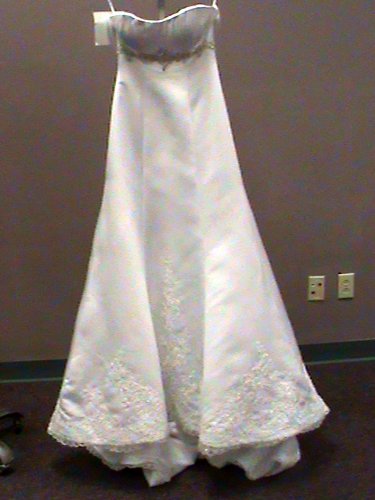 This beautiful satin fitted gown features silver beading under the bust and white buttons going all the way down the back onto the train.