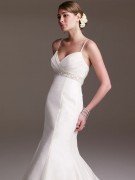 A beautiful mermaid gown. It features a lovely ruched empire bodice that is accented by a beaded and embroidered band underneath the bust and beaded spaghetti straps. The gown is completed with a taffeta skirt and buttons that shine down the back of the skirt.