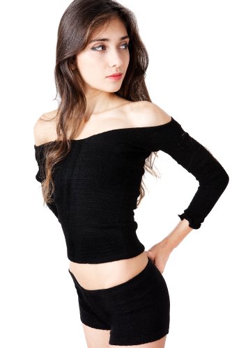 The Detailed Description of New York Black Medium Sexy Boy Shorts & Bare Shoulder Boat Neck Top by KD dance, Sexy & Comfortable Stretch Knit, Soft, Cozy & Sophisticated Fitness, Yoga, Dance, Zumba or Couch Potato Wear, Made In New York City USAFeatures