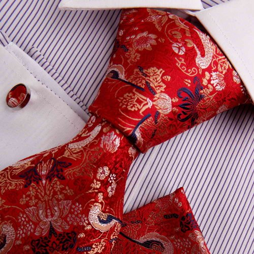 The Detailed Description of Red Mens Silk Tie Wedding Ties Crimson Patterned Woven Silk Tie Handkerchiefs Cufflinks Gift Box Set Y&G Perfect Tie Set H7030Features