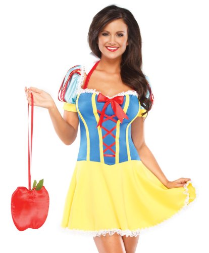 - 2PC. Costume includes knit and lycra dress with a full circle skirt trimmed with gathered lace, faux center front lace up with satin bow, contrasting faux bone channels, padded halter style collar, gathered sleeves with ribbon detailing , and satin bow at center back, padded apple purse with artificial leaves and Velcro closure