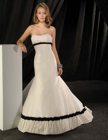 Strapless mermaid two-tone wedding gown with pleated bodice and hemline.