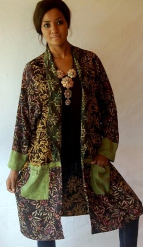 This is 'art-to-wear' that's down-to-earth. Comfortable, affordable fashion with a joyous boho attitude that celebrates color and design. When you slip into this jacket you'll feel a creative spirit wash over you. It's simply delightful!Designed with an open front, long raglan cuffed sleeves, a fold over lapel that creates a high neckline and a longer length, about mid-thigh on most. Patch pockets (Yippee!) add convenience and style.The cut is loose and generous and the body is constructed of color block patches of a compatible assortment of batiks. The rayon-based batiks are silky and soft (and become more so with each laundering) and a satiny rayon jacquard is added to the mix, creating a delicious textural contrast.This is boho fashion that's fun but practical, too. And if you'd like a pair of pants that would look great with it, check out the new wide leg gauchos in our store. It would be a match made in fashion heaven.