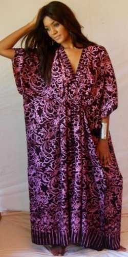 Some would say that caftans and loungewear are luxuries. They just don't know. A nice, comfy, silky caftan helps us to rejuvenate and reclaim our spirit, body and soul. And they're worth their weight in gold because when we women run out of gas, let's face it, just about everything falls apart.This little life-saving garment feels great. It's cut for comfort, with an 76-inch width, so your body and soul are completely unrestricted. It has a self-trimmed v-neckline so it's easy to put on and take off. It's made up in silky smooth rayon batiks that wash up softer each time and feel great against the skin. So, the next time you realize that you're running on empty, wouldn't it be nice to know that this is waiting for you in the closet? Along with a good book or movie, a cup of tea and maybe.............well, you'll have to fill in the blank here. I might go for chocolate cake with LOTS of frosting.