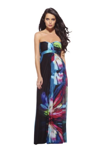 - Step into the new season in style in this ever so glam strapless multi splash maxi dress! A spring/summer tp print, the drape front and back tie adds that sexy fashion edge.. Approx length from centre back to hem: 115cmcm