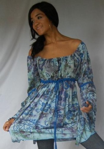 A carefree and easy-to-wear baby doll top with a stylish peasant/hippy flair and a "ready-for-some-fun" touch of whimsy.....this is what summer is all about!One of Annie's classics, this blouse starts out with a deep scoop neckline that's elasticised so that you can wear it the traditional way, on-shoulder, or go the all-out-romantic route with the off-shoulder look. Your choice. It has an elastic, raised, empire waistline that's loose, cool and comfy to wear and an encased drawstring allows you to create a fit that's just right for you.The sleeves are long and loose, with elastic above the elbow to create the peasant effect. Deliciously whimsical miniature pom-poms decorate the cuffs. The skirt is loose and gathered , length generously below the hip.Done up in a summer-weight rayon batik, a light and airy fabric with a silky smooth flow. The batik patterns are gorgeous, colors vibrant and rich.Just the thing to top off shorts or capris, gauchos or jeans. This is a flattering, comfortable aand genuinely pretty summer top that will soon become a favorite.