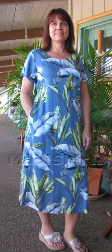 The Detailed Description of Tie Back Tea Length Dress - Women's Banana Leaf Adjustable Drawstring Back Tie Hawaiian Aloha Evening Pullover Dress in Blue - XS